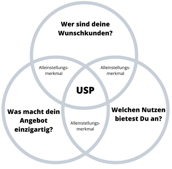 3. Das einzigartige Angebot beschreiben Formulieren wir diese 3 Punkte in Fragen um, ergeben sich als Überschneidung die Alleinstellungsmerkmale und dein einzigartiges Verkaufsargument (USP).
